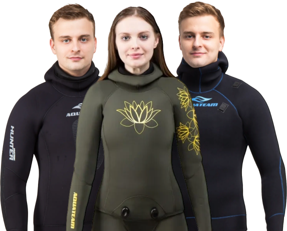 - гидрокостюмы собственного производства, изготовленные из различных материалов (нейлон, ультраспан, резина «открытая пора») и в широком диапазоне толщины – от 3 до 10 мм. Крой выполнен таким образом, чтобы специальная одежда плотно прилегала к телу и не сковывала движений пловца;